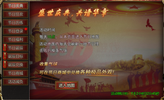 【活动内容】:每天18点可进入节日地图,打节日怪,掉灯笼,换极品外观!